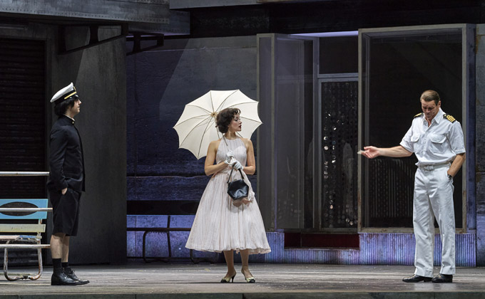 »Das verratene Meer«, 2. Szene: Josh Lovell (Noboru), Vera-Lotte Boecker (Fusako Kuroda) und Bo Skovhus (Ryuji Tsukazaki)